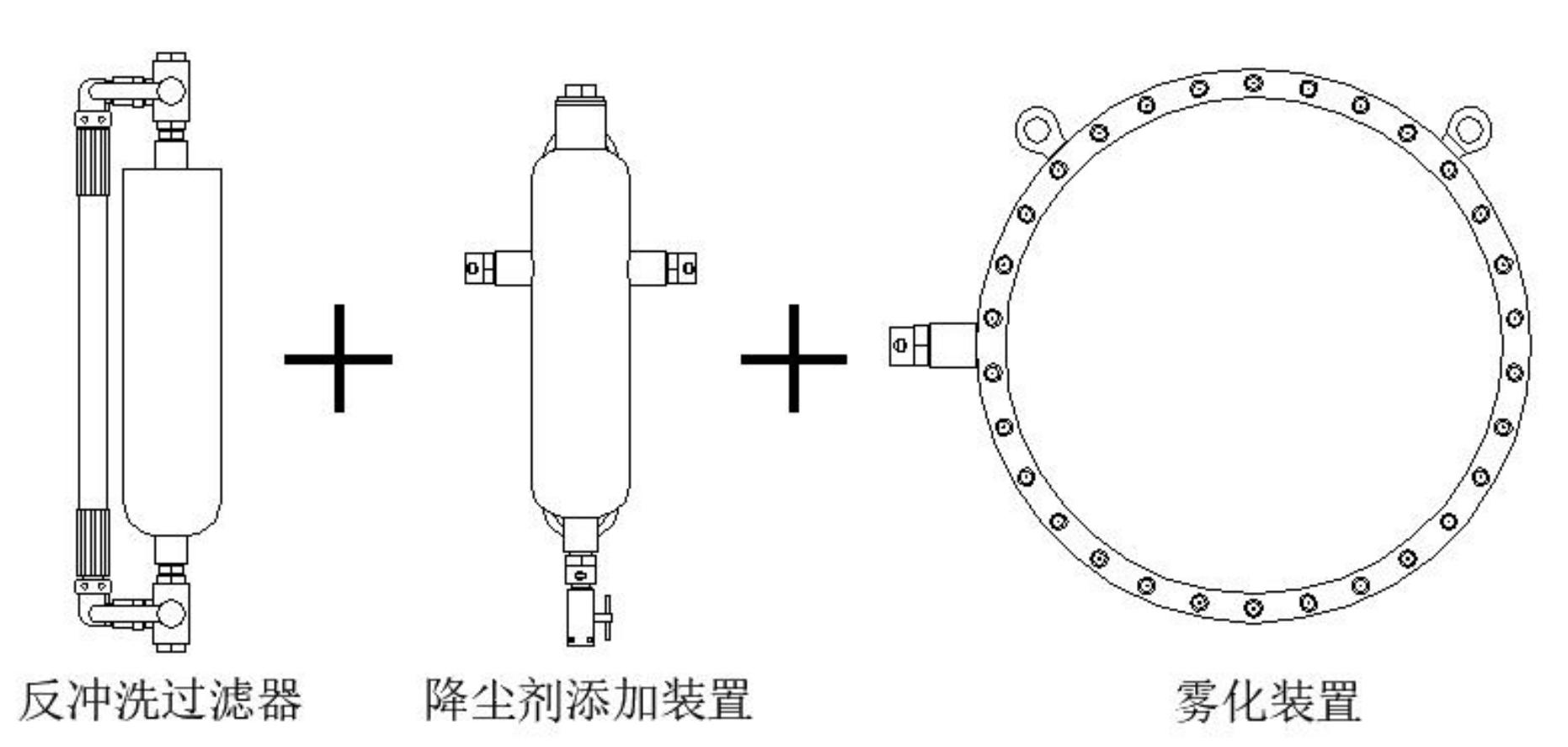 环雾化学降尘装置由反冲洗过滤器、缓释型降尘剂添装置 、强力环喷雾化