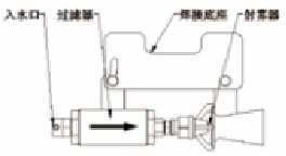 负压射流喷雾安装于支架侧护板靠立柱处,喷口朝煤壁方向。接移架喷雾水管,与移架连动。移架时开启,将架间漏煤 矸粉尘打湿凝并,抑制移架扬尘的产生。同时尾端产生负压,可吸走部分人行道污浊空气并混入雾流沉降。如下示意图所示: