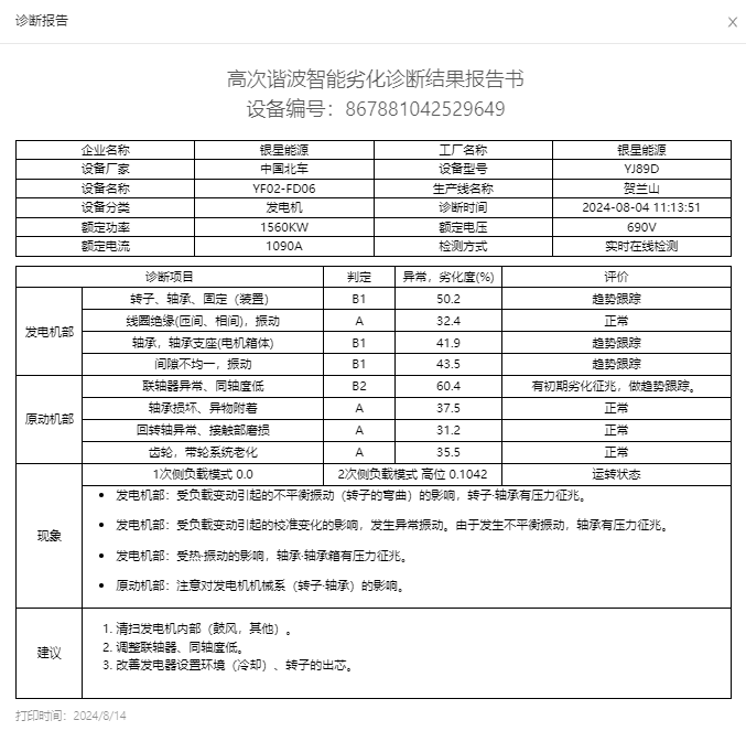 3)故障分析全面、专业:打破传统的人为分析故障的模式,依靠智能化分析,整个分析过程不需要人为干预,避免了因人员技术水平的差异而导致对检测结果的误判断,提高了诊断结果的可靠性。